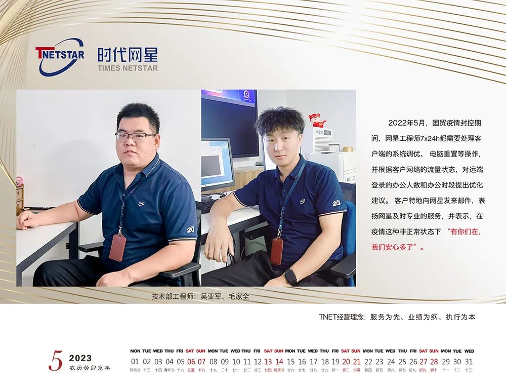 在2022年5月初的國貿(mào)臨時管控期間,吳亞軍和毛家全兩位工程師以高度的責(zé)任心和使命感,緊急應(yīng)調(diào)值守國貿(mào),在確保國貿(mào)網(wǎng)絡(luò)生產(chǎn)安全的同時,為客戶的遠程辦公提供切實的網(wǎng)絡(luò)和IT服務(wù)保障,得到了客戶的認可,提升了時代網(wǎng)星優(yōu)質(zhì)服務(wù)的良好形象??蛻籼氐匕l(fā)來郵件,“有你們在,我們安心多了”。