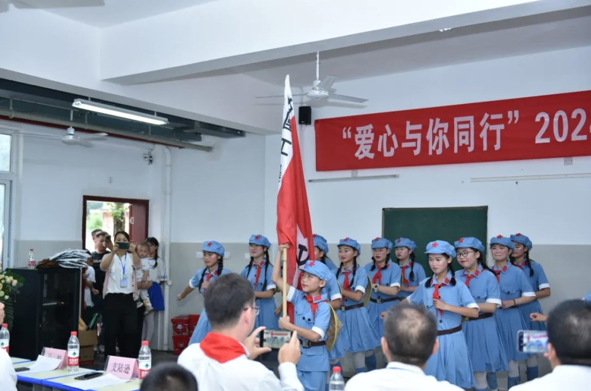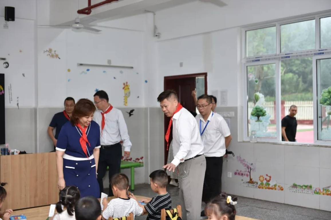 陸遜副書記、郎寬副書記、廖順雨名譽校長、梁超書記、丁志成副局長、國貿(mào)小學譚政校長及石埡村師元明支部書記共同為學生代表派發(fā)了校服、零食禮包及體育用品。