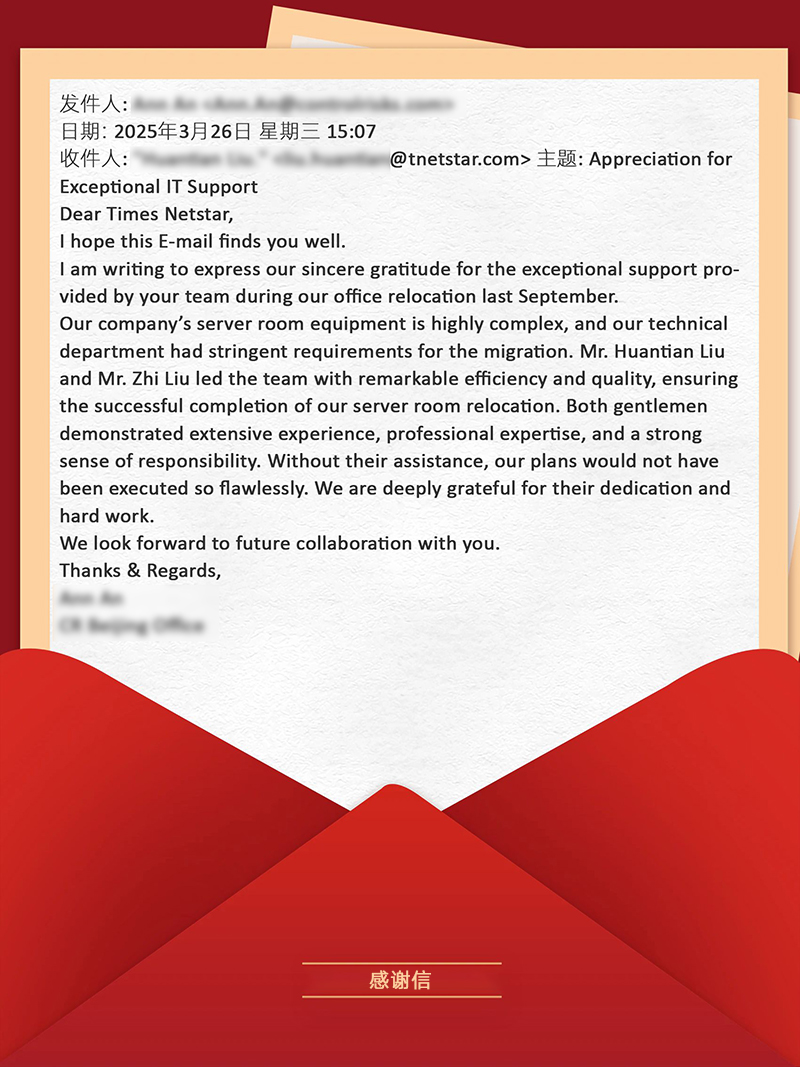 近日,時代網(wǎng)星收到來自客戶的一封感謝信,信中對我司資深客戶經(jīng)理劉煥田和技術(shù)主管劉志等服務(wù)團隊成員表示感謝,他們憑借豐富的經(jīng)驗、專業(yè)的知識和強烈的責(zé)任心滿足了客戶要求,協(xié)助客戶順利完成了服務(wù)器和機房搬遷接割工作,得到客戶的高度肯定。