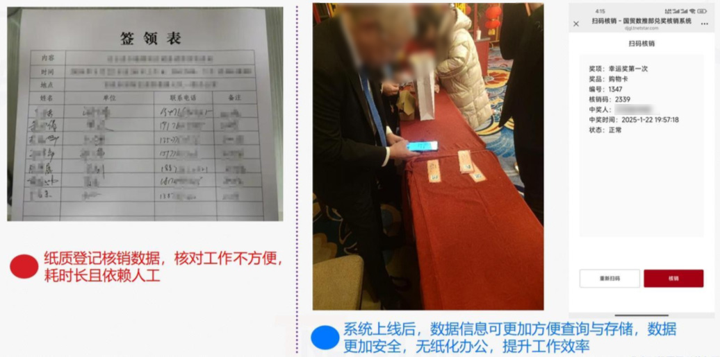 中獎(jiǎng)數(shù)據(jù)可實(shí)現(xiàn)一鍵導(dǎo)入系統(tǒng);兌獎(jiǎng)人員只需掃描二維碼即可完成核銷,大幅節(jié)省人工成本;兌換獎(jiǎng)項(xiàng)自動(dòng)存儲(chǔ),有效避免重復(fù)兌獎(jiǎng);數(shù)據(jù)統(tǒng)計(jì)功能智能化升級(jí)后,工作效率得到顯著提升。
